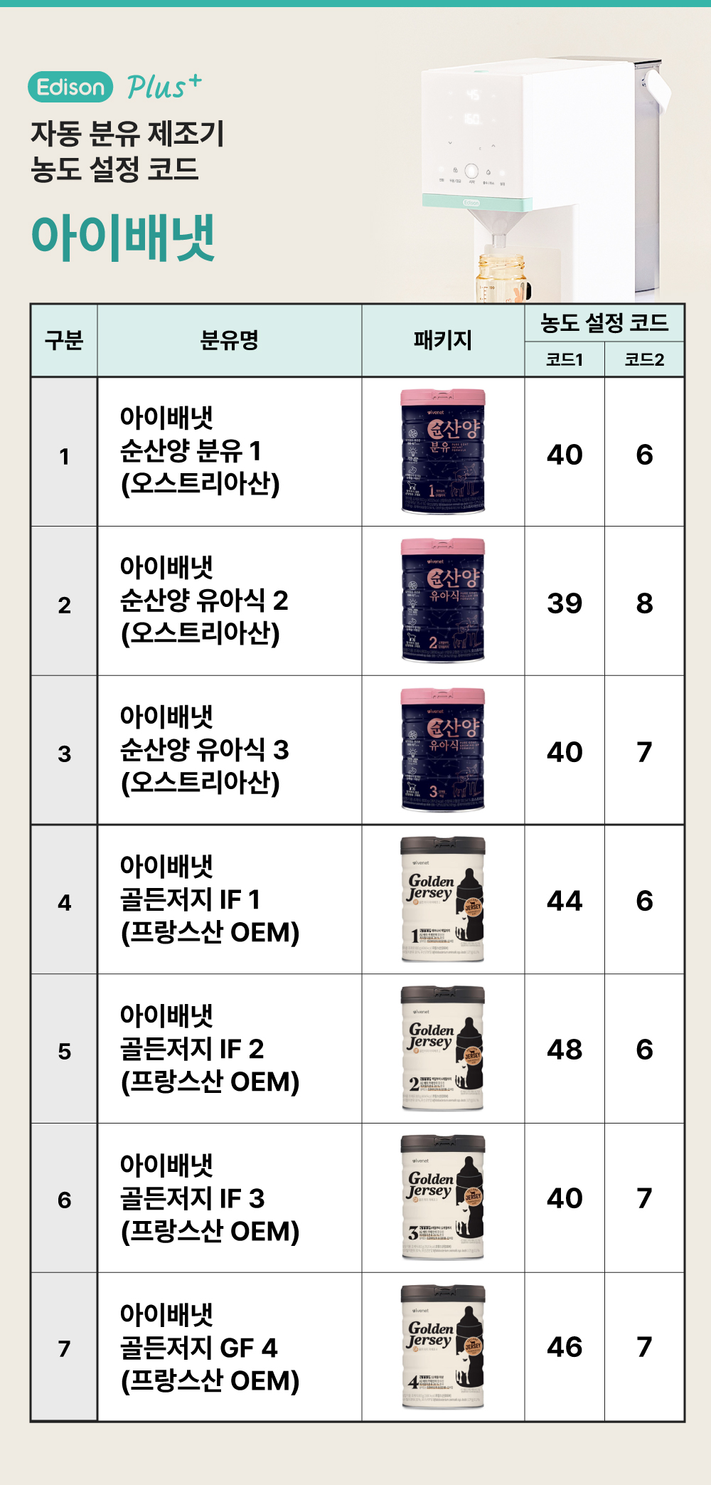 에디슨 플러스 자동 분유제조기 농도 설정 코드 [파스퇴...